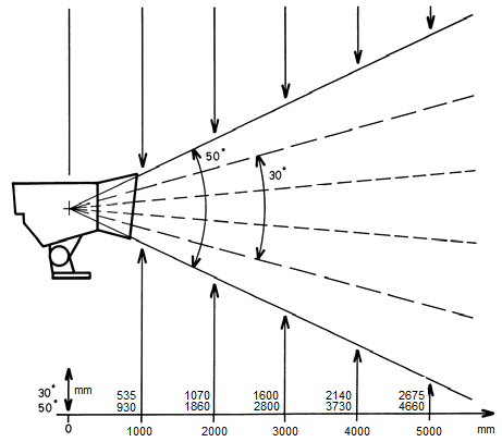 The distance between the vertical detection area of this detector and the target is a functional relationship corresponding to the scanning angle (10 ° 30 ° 50 °), as shown in the following figure: