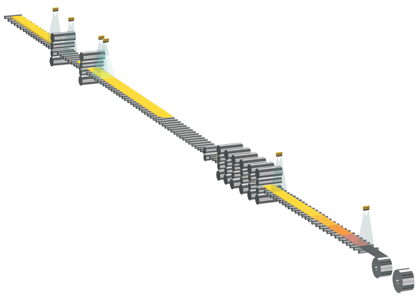 ● 设计安装在热轧带钢和热轧板材辊道上方的立体视角测宽系统是带材/板材产品宽量的新技术。对于粗轧机出口或精轧机出口处的应用,红热的带材/板材的自身热辐射为宽度测量提供了足够的对比度。对于带材/板材温度低于600 °C 的其他应用场合,我们可以提供后置光源或前置光源。
