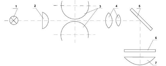 将 1 光源(LED),2 聚光镜( 1 和 2 在同一构件中)放置在轧机线材出口导卫处,光源提供准平行光,照射在 3 轧辊辊环孔型处,通过 4 成像镜片组,投影在 5 反光镜,反光镜再将光投影在 6 显示屏十字划板上,通过 7 放大镜就能清晰的观察到十字分划板上的轧辊辊环孔型。