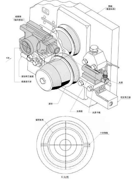 4、观察辊环孔型是否在十字刻线中间,如果孔型不在中间应调整导卫基座上的调节螺钉,使孔型在中间。